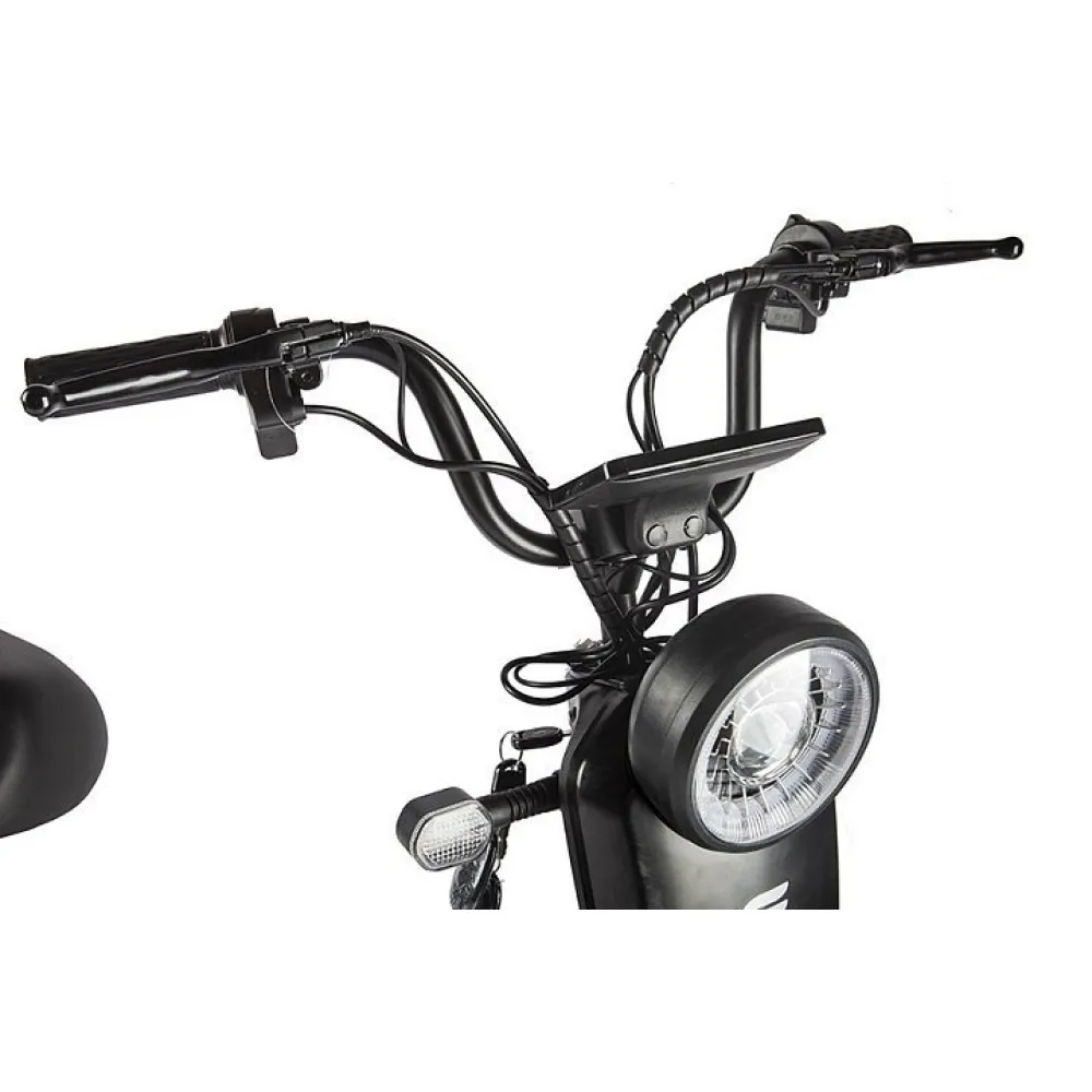 Мощность двигателя составляет 350 Вт, достаточная для развития скорости 25 км/час. Удобство и комфорт езды обеспечены мягким вместительным сиденьем, рассчитанным на двоих. Повторяя анатомические части тела материал изготовления и конструкционные особенности сиденья снижают нагрузку на позвоночник, снимают утомление.
