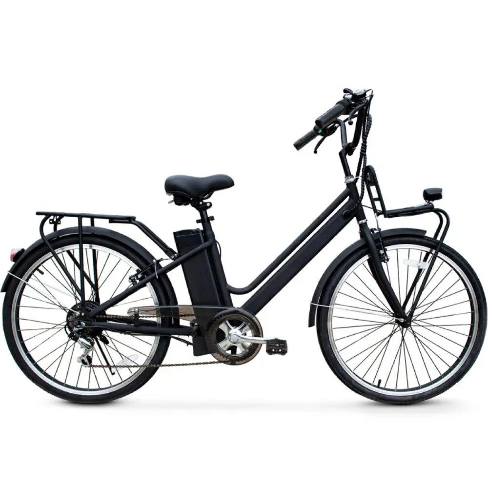 Электровелосипед Unimoto AIR, черного цвета – бюджетная версия, отлично подойдет для поездок на работу и неспешного отдыха за городом. Широкое классическое сидение и стандартные колеса 26 дюймов рассчитаны на свободное преодоление ям и кочек. Байк полностью универсален и прост – с управлением легко справятся и мужчины, и женщины.