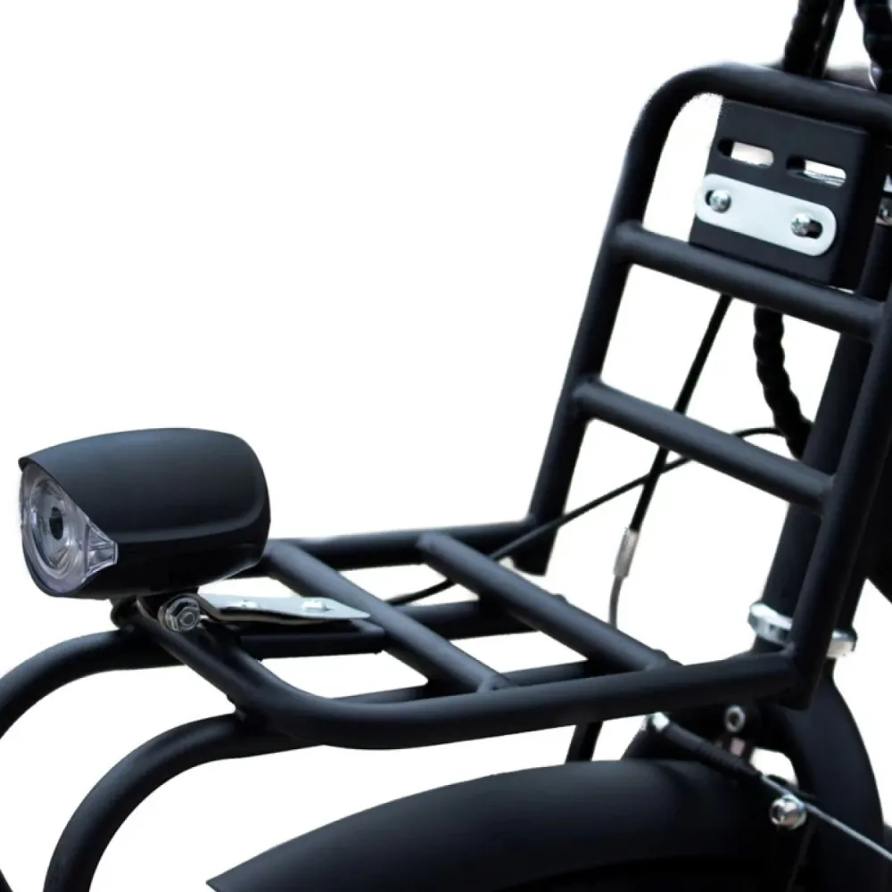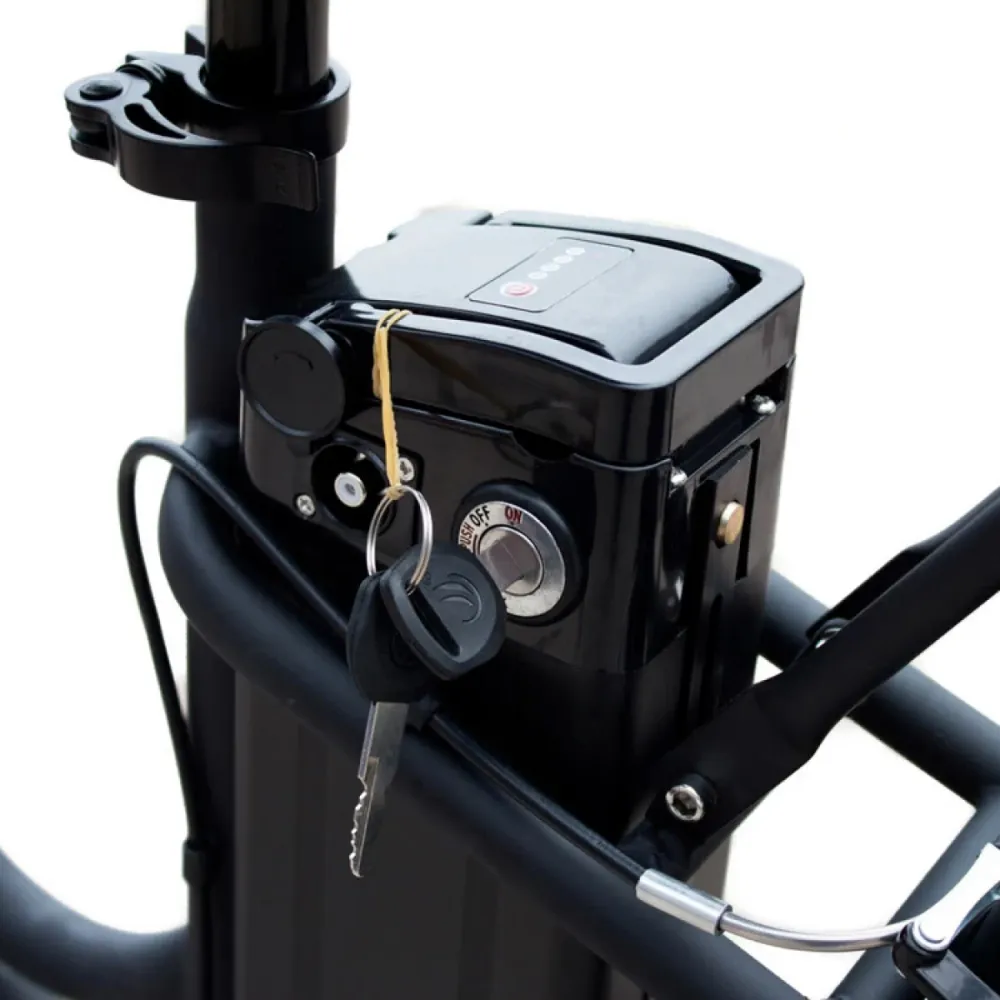 Съемный АКБ быстро заряжается за 4-5 часов и не требует особых усилий в обслуживании – достаточно обычной розетки 220 В. Производитель батарею расположил под седлом, а в заднее колесо встроил электромотор мощностью 350 Вт. Три режима езды позволят райдеру определить комфортный стиль поездки. Оказавшись в экстремальной ситуации или просто забыв подзарядить батарею, можно перейти на педальный режим. Для любителей поездок по ночному городу байк оборудован яркими габаритными огнями и фарами, которые хорошо освещают путь.
