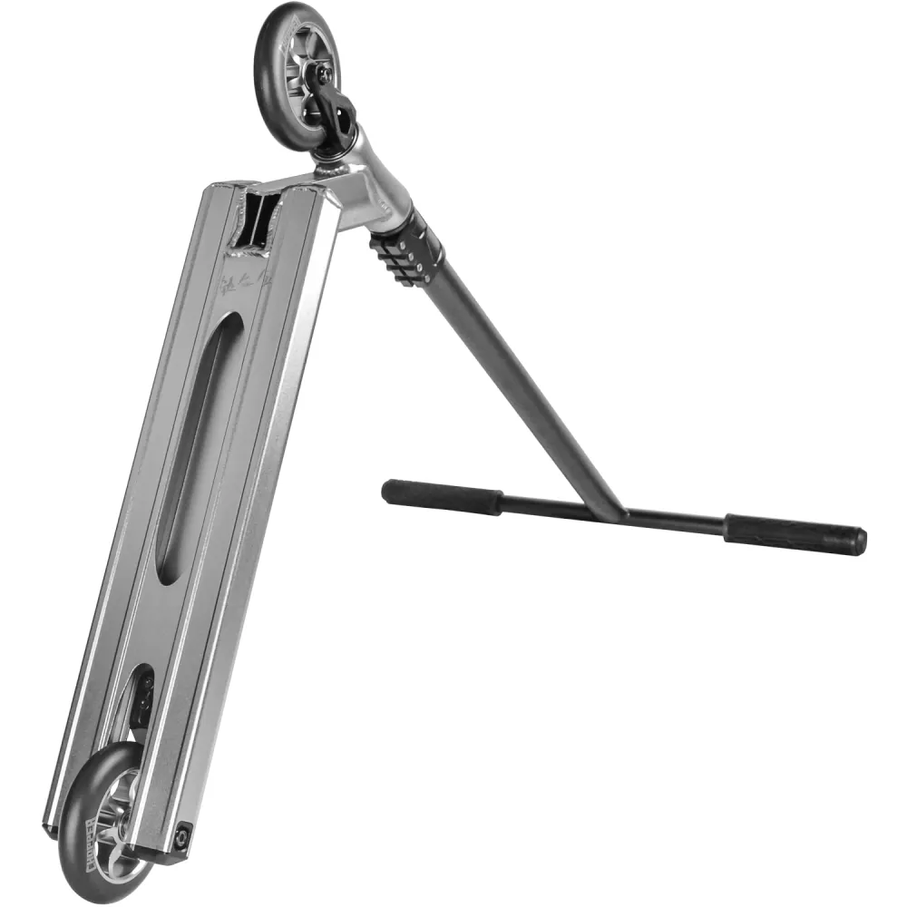 Сравнительно легкий вес самоката обусловлена облегченным алюминием, из которого изготовлены дека, вилка и колесные диски. Небольшое использования стали позволило сделать технику дешевле. Благодаря большому диаметру колес самокат имеет максимальный накат, который нравится всем райдерам без исключения. Выполняемые трюки с маневрами становятся легкими и безопасными. В сочетании с современным дизайном модель смотрится стильно и инновационно.